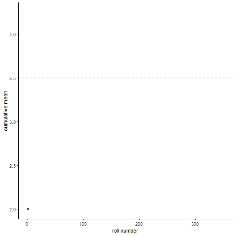 rolls_df <- mutate(rolls_df, cummean=cummean(rolls), rollnumber=seq.int(nrow(rolls_df)), distance_from_mean=abs(cummean-mean(1:k)))